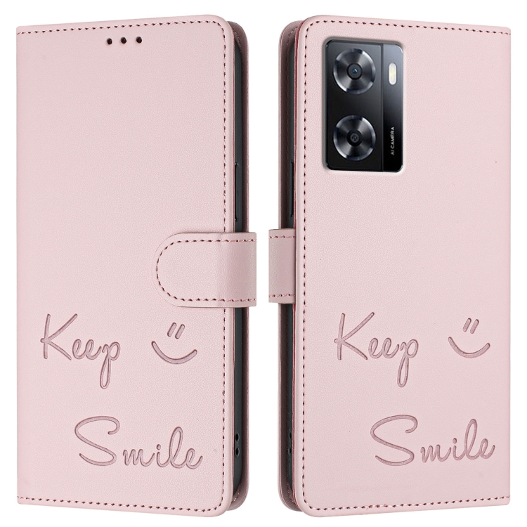 Funda de Cuero Rfid con Relieve Sonriente para Oppo A77 4G/A77S 4G (Rosa)