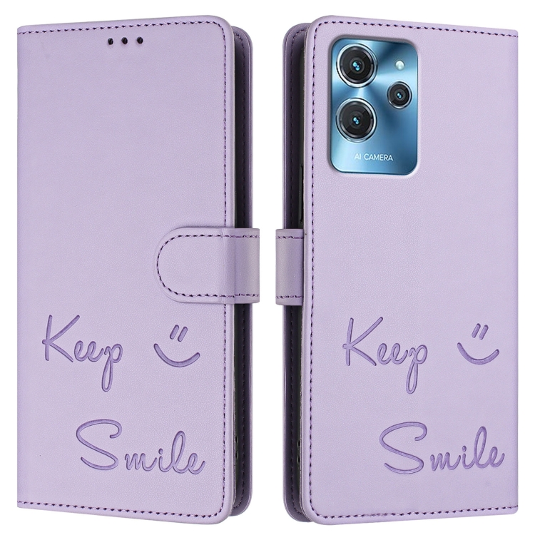 Funda de Cuero Rfid para Oukitel C32 con Relieve Sonriente (Morado Claro)