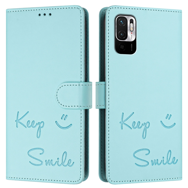Funda de Cuero Rfid con Relieve Sonriente para Redmi Note 10 5G/Note 10T 5G (Verde Menta)