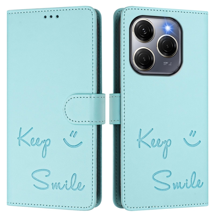 Funda de Cuero Rfid con Relieve Sonriente para Tecno Spark 20 Pro 5G (Verde Menta)