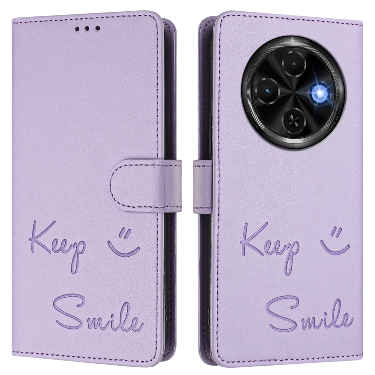 Funda de Cuero Rfid con Relieve Sonriente para Tecno Spark 30C (Morado Claro)