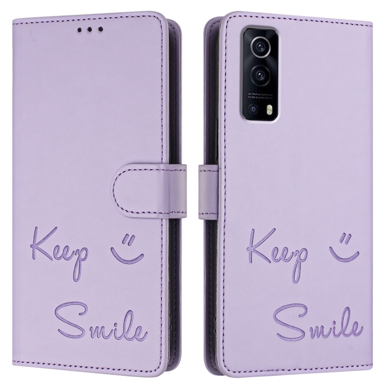Funda de Cuero Rfid con Relieve Sonriente para Vivo Y72 5G / Iqoo Z3 / Y52 5G (Morado Claro)