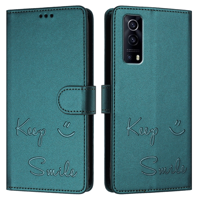 Funda de Cuero Rfid con Relieve Sonriente para Vivo Y72 5G / Iqoo Z3 / Y52 5G (Verde Pavo Real)