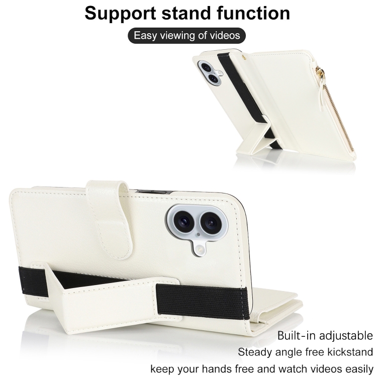 Funda de Cuero Rfid para iPhone 16 Plus con Cierre de Cremallera y Soporte para Pulsera (Blanco)