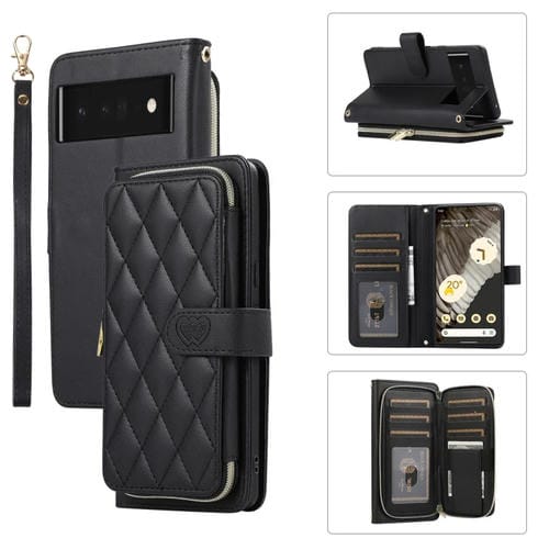 Funda de Cuero Tipo Billetera con Cremallera Completa y Diseño Rombal para Google Pixel 6 Pro (Negra)