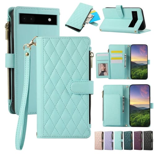 Funda Cuero Tipo Billetera con Cremallera y Diseño Rombal para Google Pixel 6A (Cian)