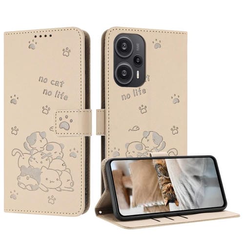 Funda de Piel con Diseño de Gatito En Relieve y Cordón para Xiaomi Poco F5 (Beige)