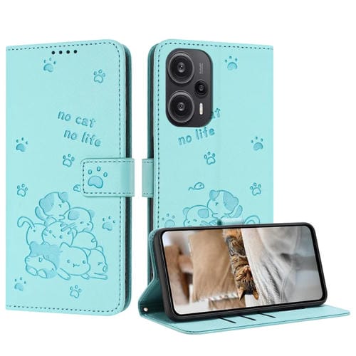 Funda de Piel con Diseño de Gatito En Relieve para Xiaomi Poco F5 con Cordón (Verde Menta)