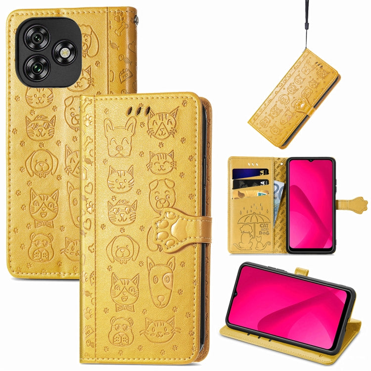 Funda de Piel con Relieve de Gato y Perro para Oukitel C53 (Amarilla)