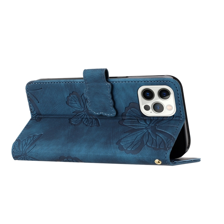 Funda de Piel con Relieve de Mariposa para iPhone 16 Pro (Azul)
