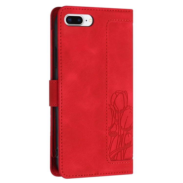 Funda de Piel con Relieve de Tulipanes para iPhone 8 Plus/7 Plus con Cordón (Rojo)