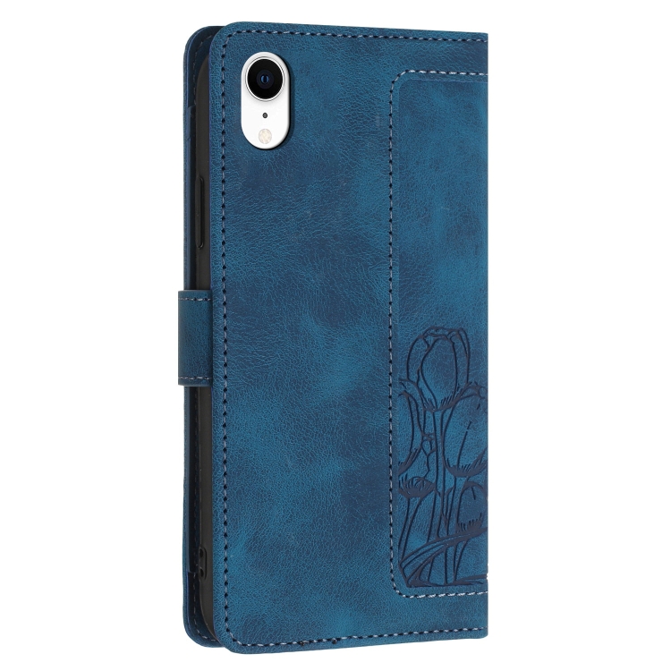 Funda de piel con relieve de tulipanes para iPhone Xr con cordón (Azul)