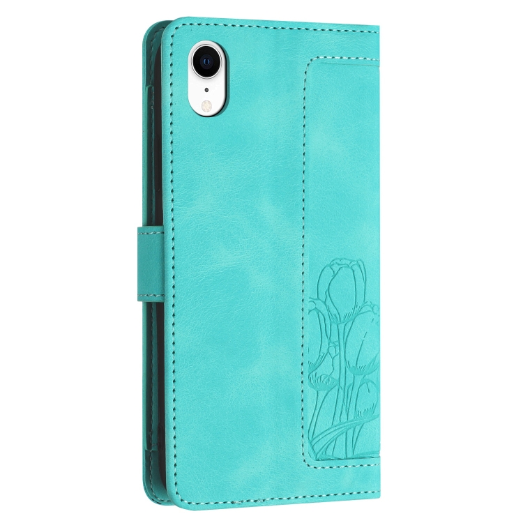 Funda de Piel con Relieve de Tulipanes para iPhone Xr con Cordón (Verde)