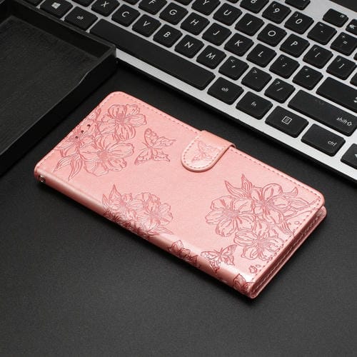 Étui de téléphone PU en relief de peau de papillon de fleur de cerisier pour iPhone 12 Pro Max (or rose)