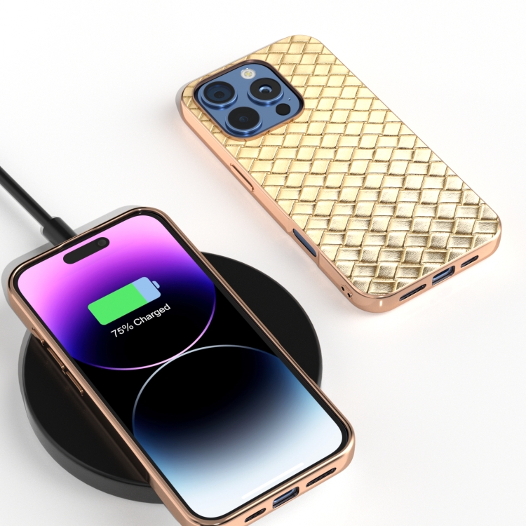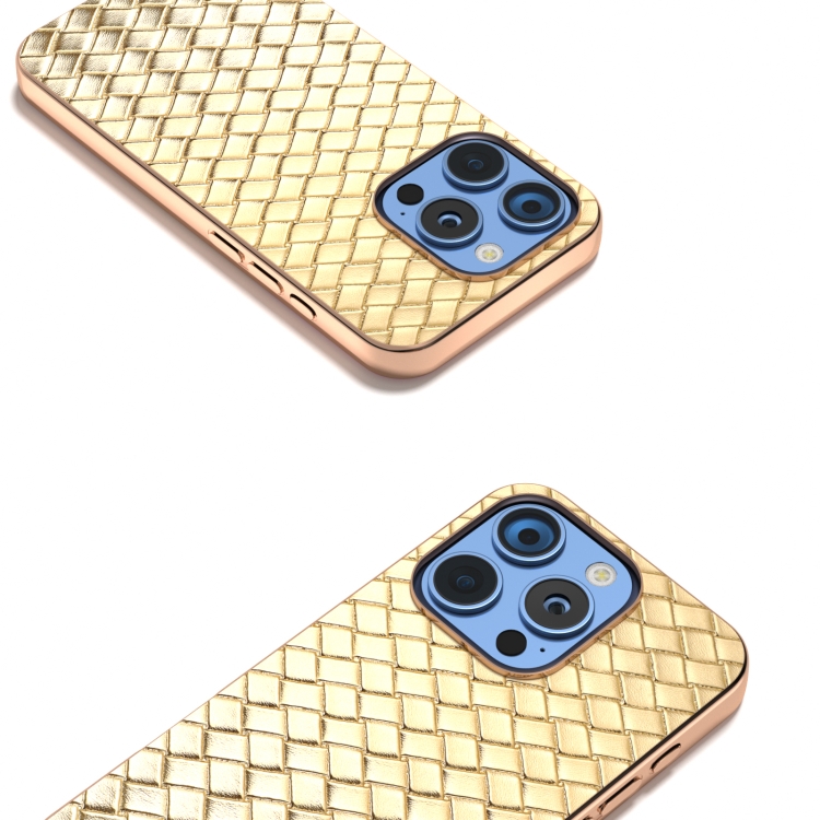 Funda de teléfono PU con textura tejida y marco galvanizado para iPhone 16 Pro (Dorada)