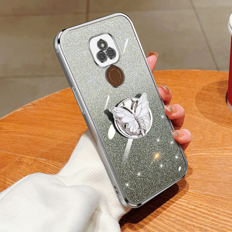Funda TPU con Soporte Mariposa Purpurina Degradada para Motorola Moto E7 Plus (Plateada)