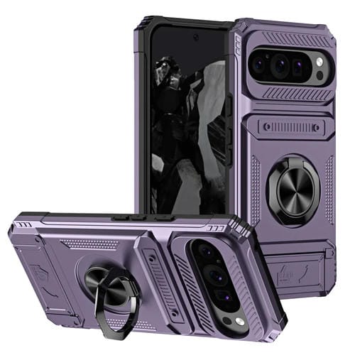 Funda híbrida TPU y PC para Google Pixel 9 Pro XL con soporte de anillo de metal (Morado)