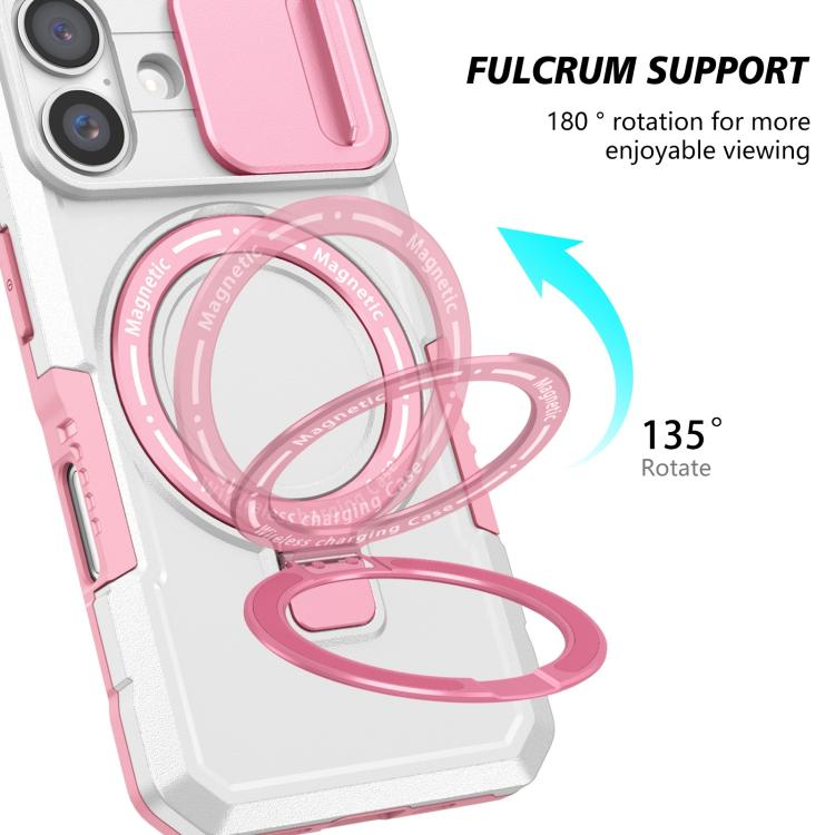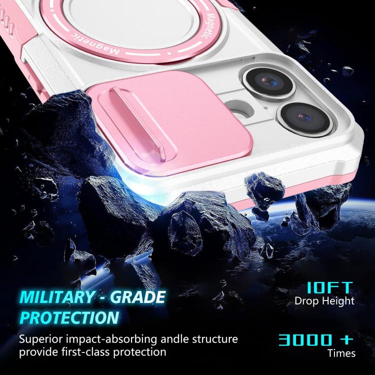 Funda híbrida TPU y PC con soporte Magsafe y protección deslizante para iPhone 16 Plus (Rosa y Blanco)