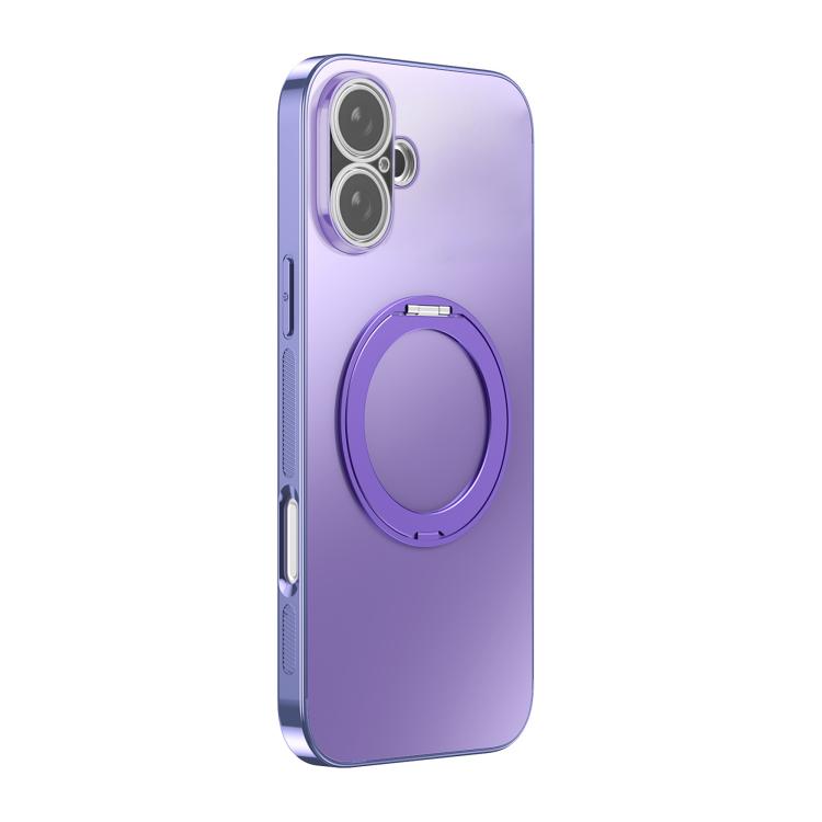 Funda MagSafe electrochapada para iPhone 17 con soporte giratorio de 360 grados y cubierta para lente (morado claro).
