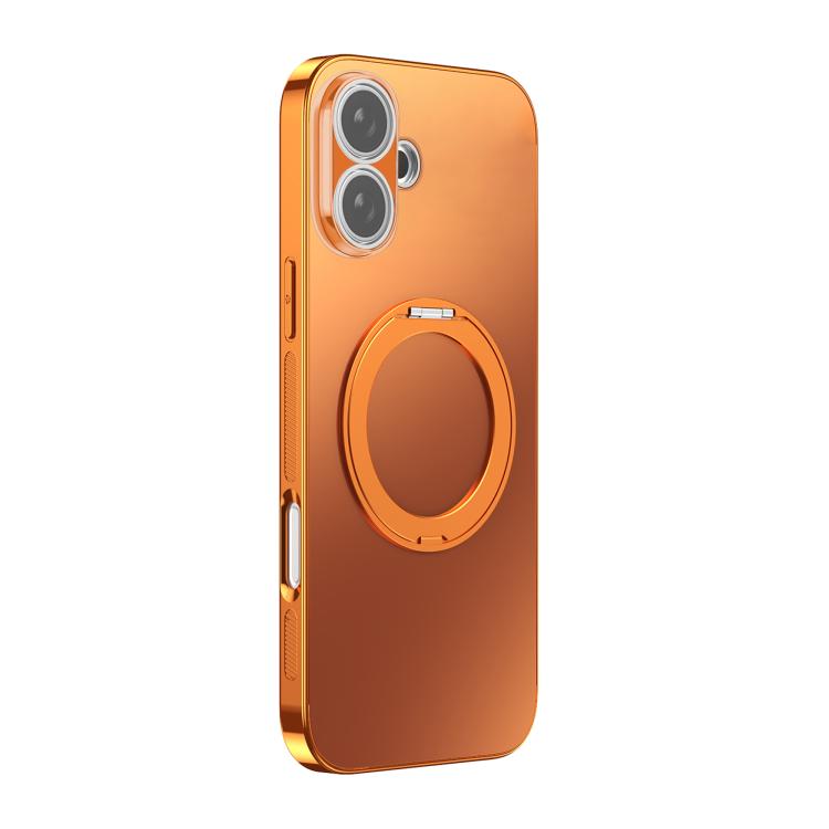 Funda MagSafe electrochapada para iPhone 17 con soporte giratorio de 360 grados y cubierta para lente (naranja).