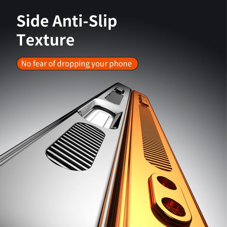 Funda MagSafe electrochapada para iPhone 17 Pro con soporte giratorio de 360 grados y cubierta para lente (naranja).