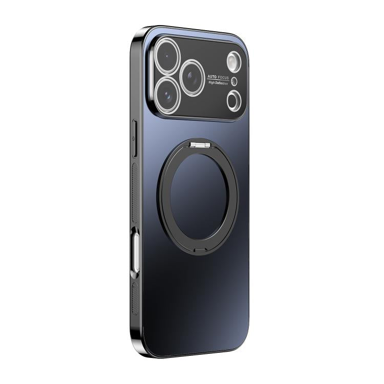 Funda MagSafe electrochapada para iPhone 17 Pro con soporte giratorio de 360 grados y cubierta para lente (negra).