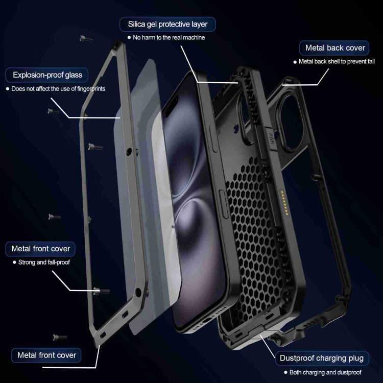 Funda metálica triple Redpepper para iPhone 16 a prueba de golpes (Negra)