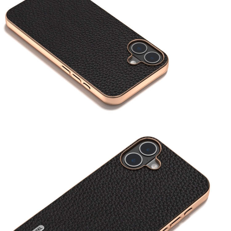 Funda para iPhone 16 Abeel con Marco Galvanizado y Textura de Lichi de Cuero Genuino (Negro)