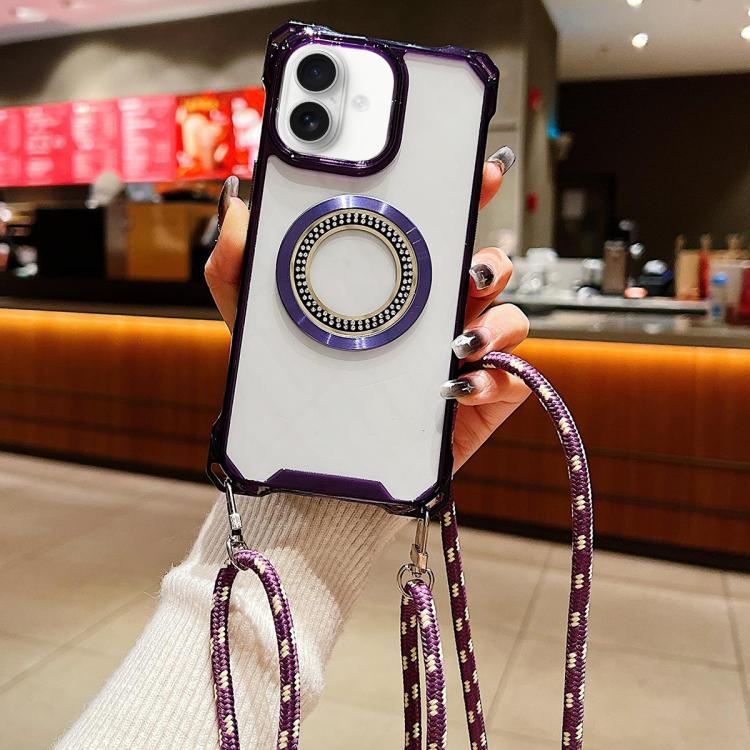 Funda para iPhone 16 TPU Transparente con Correa Cruzada y Cierre de Cuatro Esquinas (Morado)