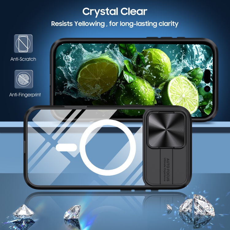 Funda para iPhone 16 Plus Cubierta Deslizante Acrílico Transparente PC TPU Magsafe (Negra)