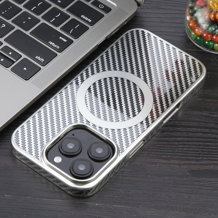 Funda para iPhone 16 Pro Carcasa PC Fibra de Carbono Transparente Revestimiento Magsafe 6D (Plata Starlight)