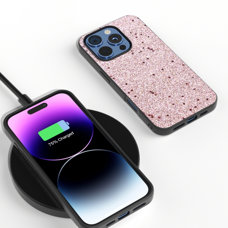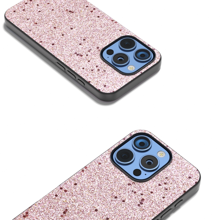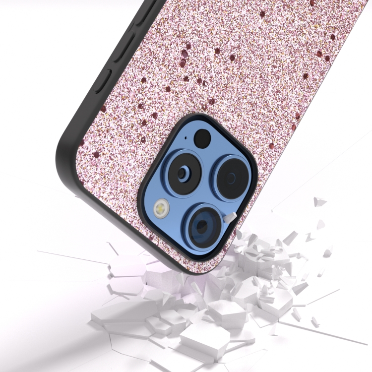 Funda para iPhone 16 Pro con Marco Negro y Purpurina a Prueba de Golpes (Dorado y Rosa)