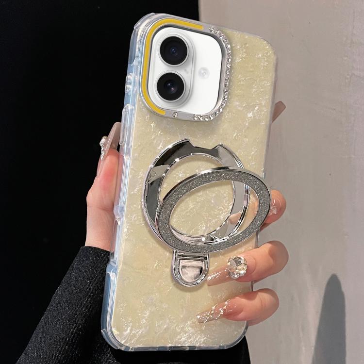 Funda para iPhone 17 con carcasa dorada y colorida, diseño estampado en TPU+IMD, con soporte magnético brillante (amarilla).