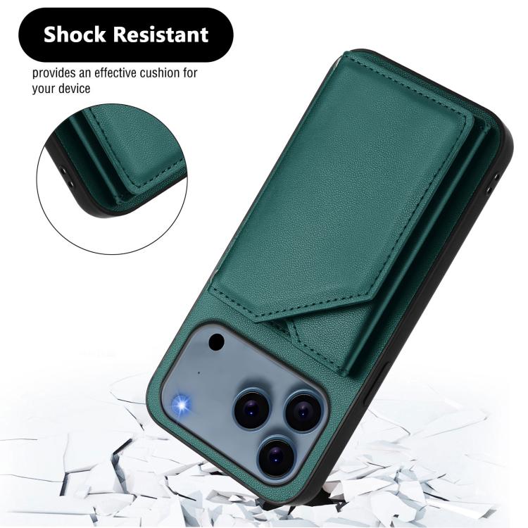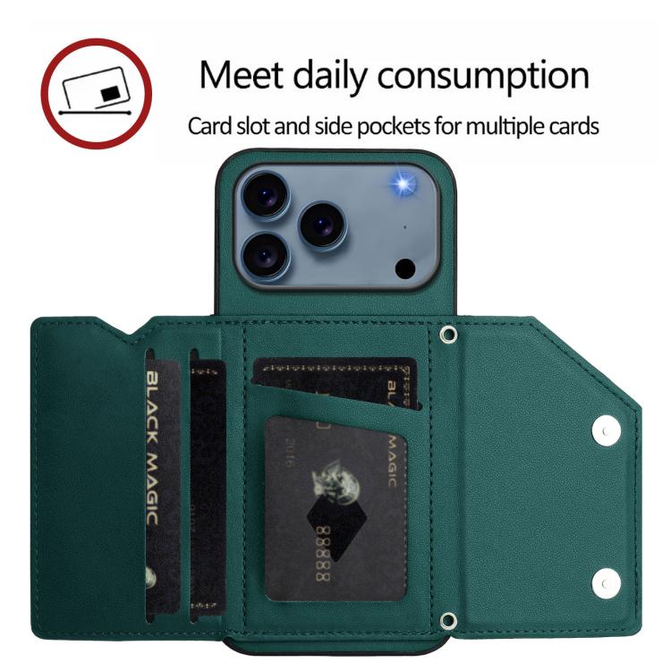 Funda para iPhone 17 Pro Max con cuatro ranuras para tarjetas y correa para la muñeca (verde)