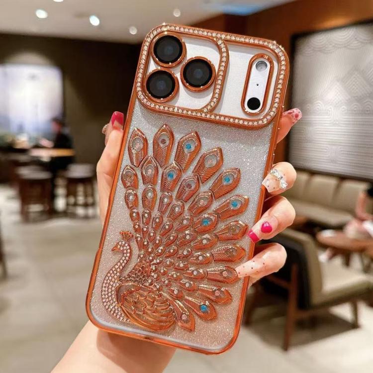Funda para iPhone 17 Pro Max de TPU electrochapado con relieve de pavo real y purpurina de diamantes de imitación, con protector de lente (naranja).