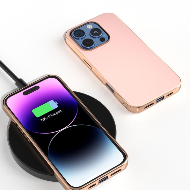 Funda para teléfono iPhone 16 Pro con marco galvanizado de cuero sintético de cobertura total (Rosa Claro)