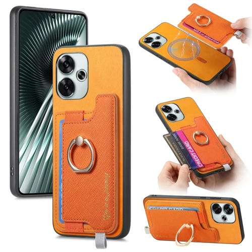 Funda para Teléfono con TaRJetero y Anillo de Cuero con Diseño Retro Magsafe Cross para Redmi Turbo 3 5G (Amarillo)