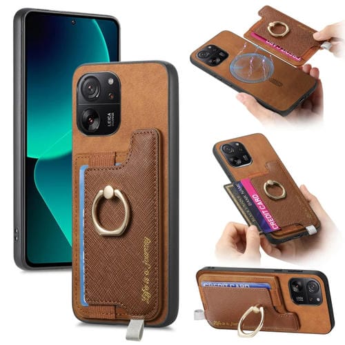 Funda para Teléfono con TaRJetero y Anillo de Cuero con Diseño Retro Magsafe Cross para Xiaomi 13T/13T Pro (Marrón)
