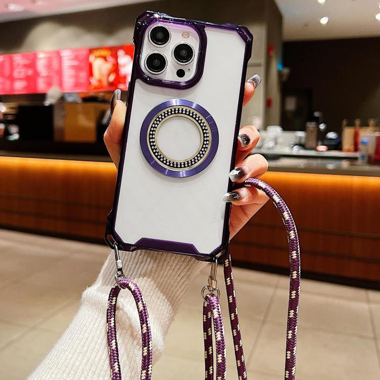 Funda para Teléfono TPU iPhone 16 Pro Traveler Crossbody con Cuatro Esquinas y Cordón (Morado)