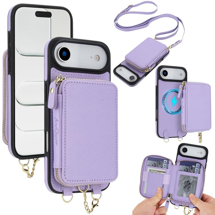 Funda tipo cartera bandolera con cremallera 2 en 1 AwQuer para iPhone Air con parte trasera de cuero (morado claro)