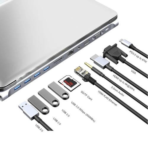 - Incluye 1 Lector de Tarjetas Micro SD y 1 Lector de Tarjetas TF con Soporte para lectura simultánea; 1 Puerto USB 3.0 con velocidad hasta 5 Gbps; 3 Puertos USB 2.0 con velocidad de 480 Mbps; Puerto de Carga tipo C PD con potencia máxima de 87 W; salida HDMI 4K UHD y VGA; Puerto de audio de 3,5 mm; Puerto Ethernet RJ45 100M compatible con LAN 10 Mbps