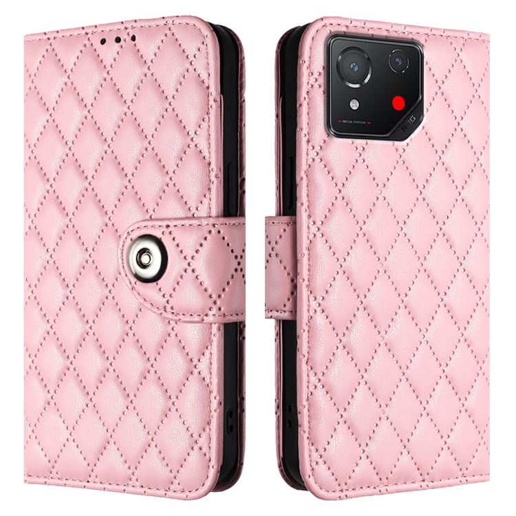 Funda de Cuero para Asus Rog Phone 8 con Tapa, Textura Rómbica y Cordón (Rosa)