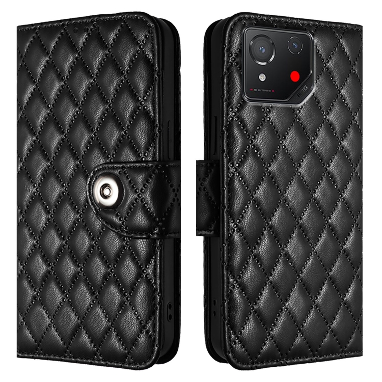 Funda para Asus Rog Phone 8 con Tapa de Cuero, Textura Rómbica y Cordón (Negro)