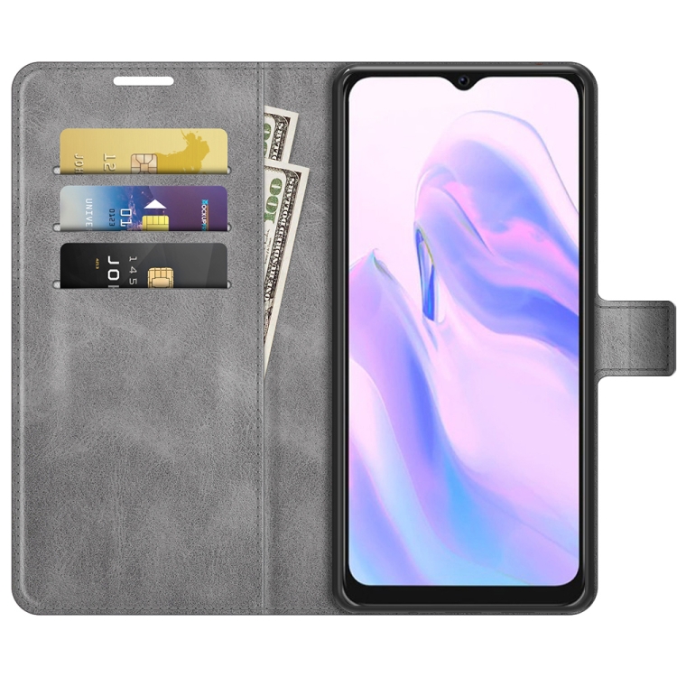 Funda Cuero BlackView A70 Retro Becerro Patrón Hebilla Horizontal Flip con Soporte y Ranuras para Tarjetas (Gris)
