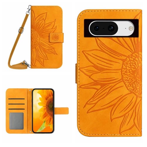 Funda para Google Pixel 8A Skin Feel Sun Flower de Cuero con Tapa en Relieve y Cordón (Amarillo)