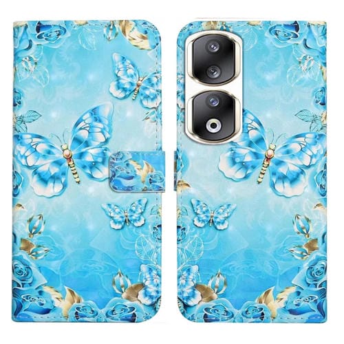Funda de Cuero para Honor 90 Pro con Dibujo 3D en Relieve al Óleo (Mariposas Azules)