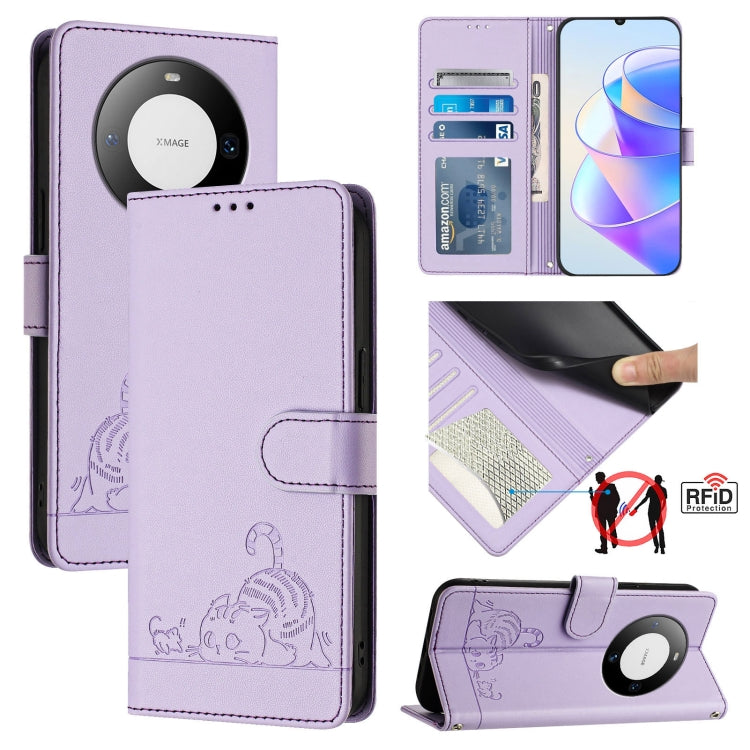 Funda para Huawei Mate 60 Pro y 60 Pro+ de Cuero Rfid con Patrón en Relieve Cat Rat y Cordón (Púrpura)