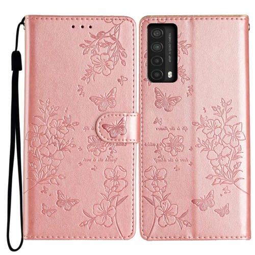 Funda de Cuero para Huawei P Smart 2021 y Y7A con Relieve Flor y Mariposa (Oro Rosa)
