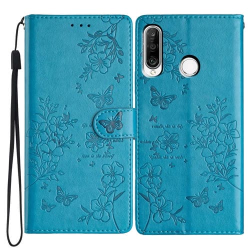 Funda para Huawei P30 Lite de Cuero con Relieve de Flor y Mariposa (Azul)