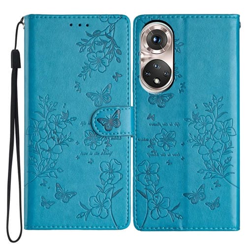 Funda para Huawei P50 de Cuero con Relieve Flor de Amor y Mariposa (Azul)